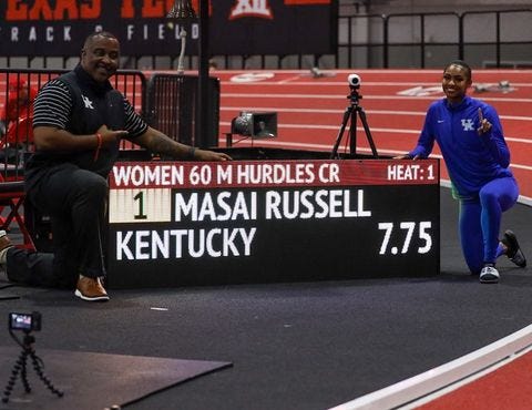 The U.S. Track & Field and Cross Country Coaches Association tweeted that last Friday after Masai Russell of the University of Kentucky had set a collegiate record in winning the women’s 60-meter hurdles in the Red Raider Invitational at Texas Tech University.