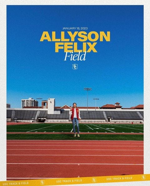 Another honor: USC re-named the field at its on-campus track and field facility in honor of Allyson Felix on Jan. 18.
